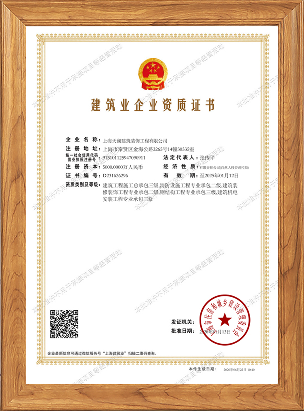 上海天瀾建筑裝飾工程有限公司由熱愛裝修事業(yè)的專業(yè)人士創(chuàng)辦,經(jīng)上海工商行政管理局注冊登記的專業(yè)上海工裝公司。天瀾建筑裝飾注冊資本5000萬,擁有建筑施工總承包三級,鋼結(jié)構(gòu)工程專業(yè)承包三級建筑裝飾工程專業(yè)承包二級,建筑機(jī)電設(shè)備安裝專業(yè)承包三級,消防設(shè)施工程專業(yè)承包二級等資質(zhì)。國家建筑裝飾裝修工程設(shè)計(jì)與施工二級資質(zhì)單位、上海市建筑裝飾裝修行業(yè)協(xié)會(huì)會(huì)員單位、有上海市建設(shè)和交通委員會(huì)頒發(fā)的“安全生產(chǎn)許可證”。