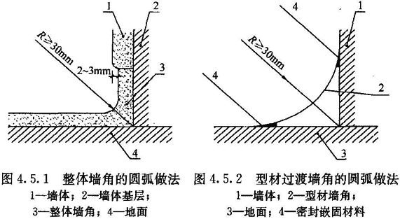 4.5.1 地面與墻面的夾角應為曲率半徑只不小于30mm的圓角。當用柔性材料粘貼地面時,在墻面上應延伸至地面以上形成圓角并與墻面平齊,或略縮進2mm~3mm,突出的墻面應圓滑過渡(圖4.5.1)。需經(jīng)常沖刷的地面,地面材料在墻面上延伸高度應大于150mm。