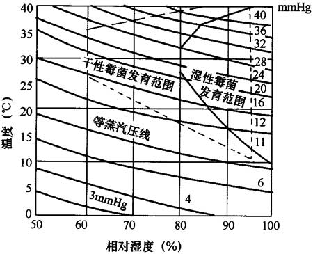 6.2.7、6.2.8 本節(jié)對(duì)圍護(hù)結(jié)構(gòu)內(nèi)表面抗菌涂飾工程進(jìn)行了規(guī)定,由于在食品工業(yè)用房?jī)?nèi)使用抗菌涂飾工程目前在國(guó)內(nèi)外意見(jiàn)不太統(tǒng)一,擔(dān)心抗菌產(chǎn)品會(huì)使食品中產(chǎn)生抗藥性菌株,但對(duì)于濕度經(jīng)常超過(guò)75%或有蒸汽作業(yè)的房間或關(guān)鍵區(qū)域的抗菌防霉問(wèn)題,目前仍沒(méi)有更好的解決辦法,內(nèi)表面抗菌有很多方法,如消毒,但本規(guī)范僅對(duì)使用抗菌涂料的情況進(jìn)行了規(guī)定。當(dāng)相對(duì)濕度達(dá)到80%時(shí),不論溫度高低,基本上都要發(fā)霉,見(jiàn)圖4,所以此時(shí)可涂防霉涂料。