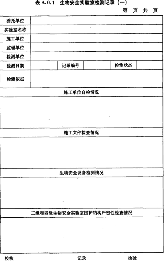 A.0.1 生物安全實驗室施工方自檢情況、施工文件檢查情況、生物安全柜檢測情況、圍護結構嚴密性檢測情況應按表A.0.1進行記錄。